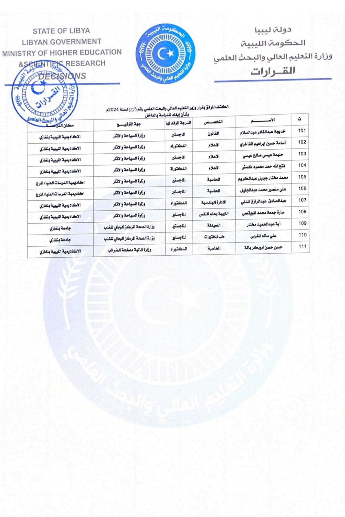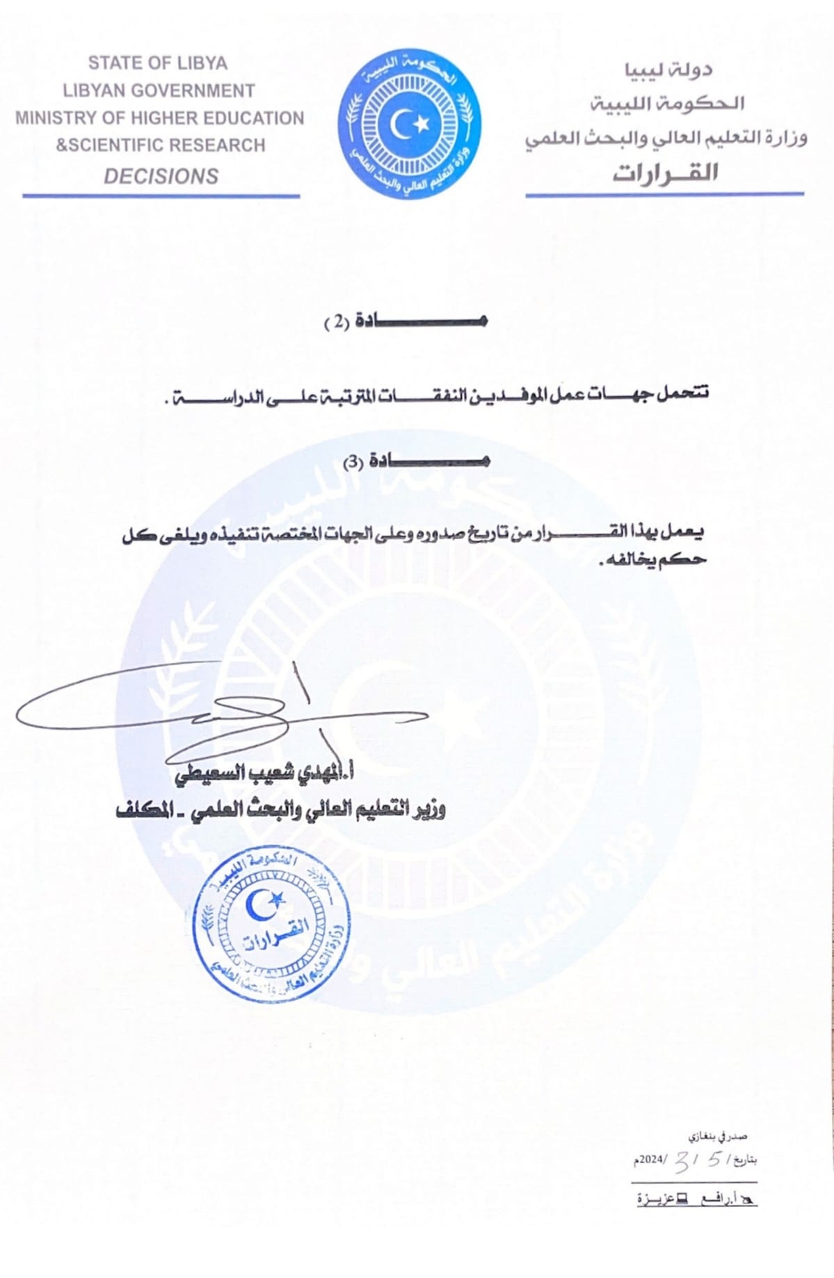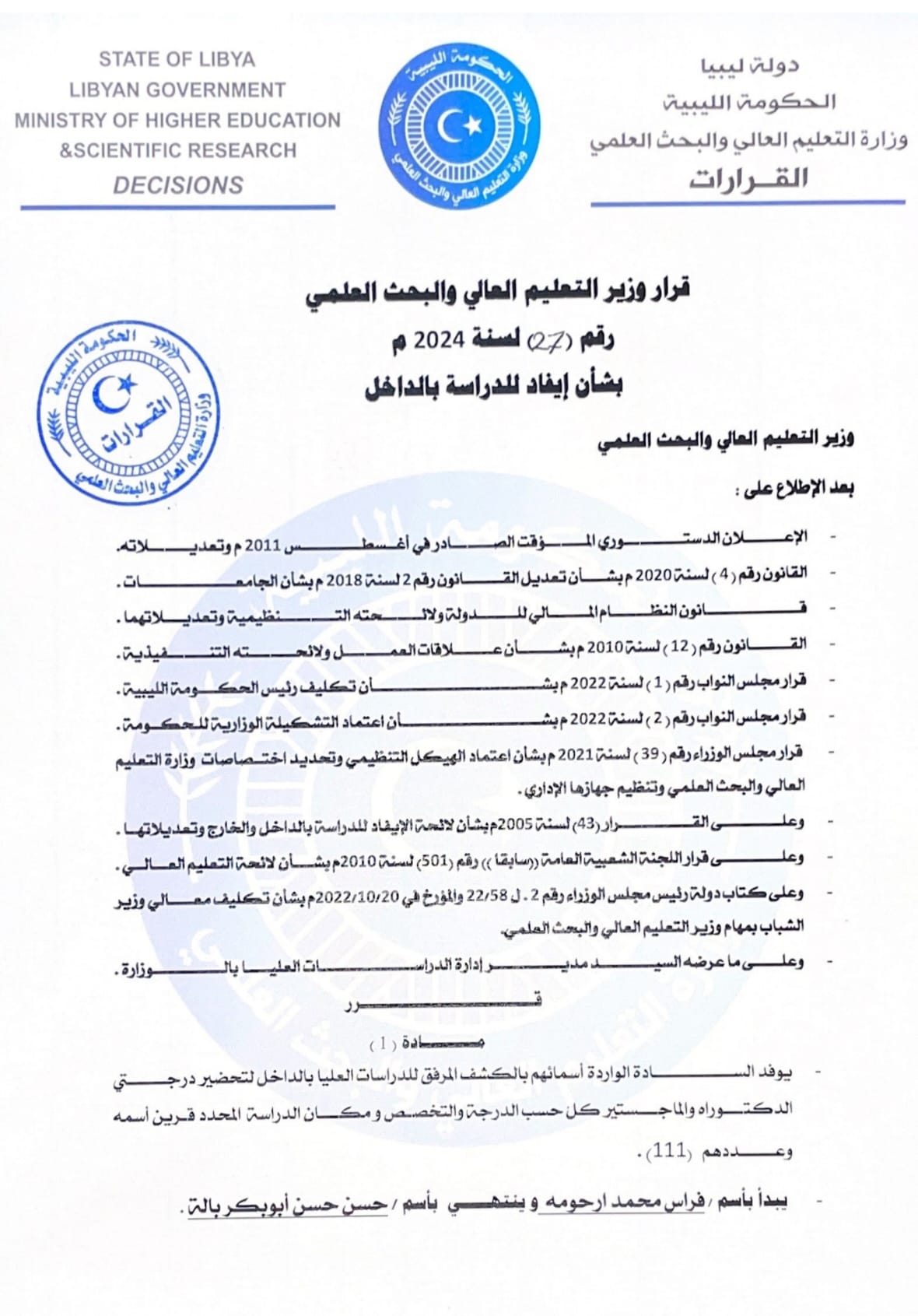 وزارة التعليم العالي والبحث العلمي بالحكومة الليبيةيونيو 13, 2024Comment 0 #خبر #قرارات قرار معالي وزير التعليم العالي و البحث العلمي أ. المهدي شعيب السعيطي رقم ( 27 ) لسنة2024م بشأن إيفاد للدراسة بالداخل لعدد ( 111 ) طالب لتحضير درجتي الدكتوراه والماجستير كلٌ حسب درجته واختصاصه. #مكتب_التواصل_و_الإعلام Share this post قرار ايفاد 46 لسنة 2024 Related Posts مدير إدارة التخطيط والتطوير تطلع على الخطة الإستراتيجية لكلية القانون Posted on يوليو 9, 2024 وكيل وزارة التعليم العالي والبحث العلمي يجتمع مع مدراء الإدارات المعنية Posted on يوليو 9, 2024 وزارة التعليم العالي والبحث العلمي تباشر في حملة دعم المؤسسات التعليمية Posted on يوليو 3, 2024