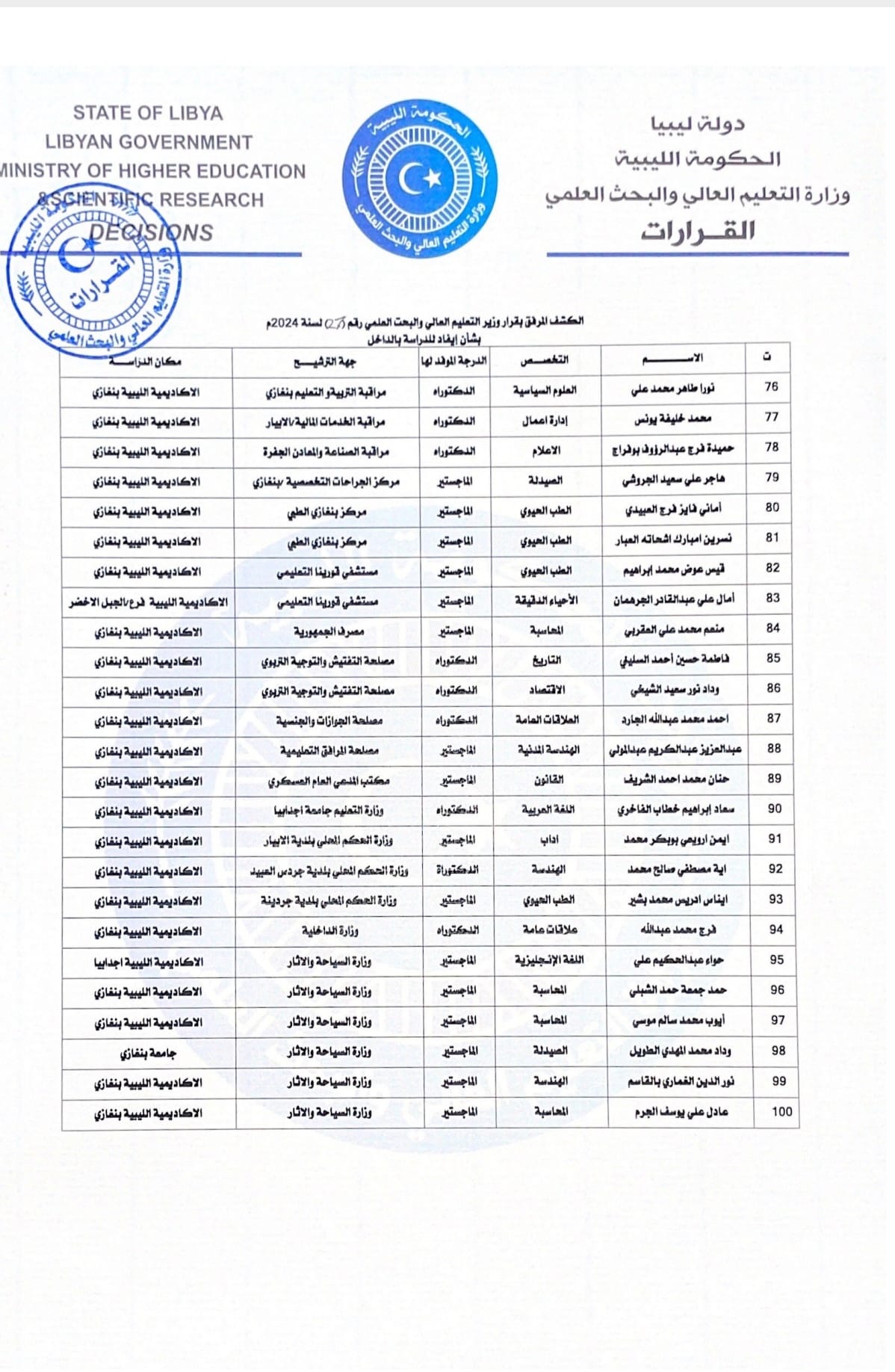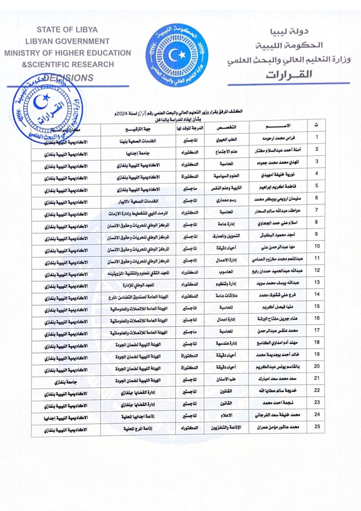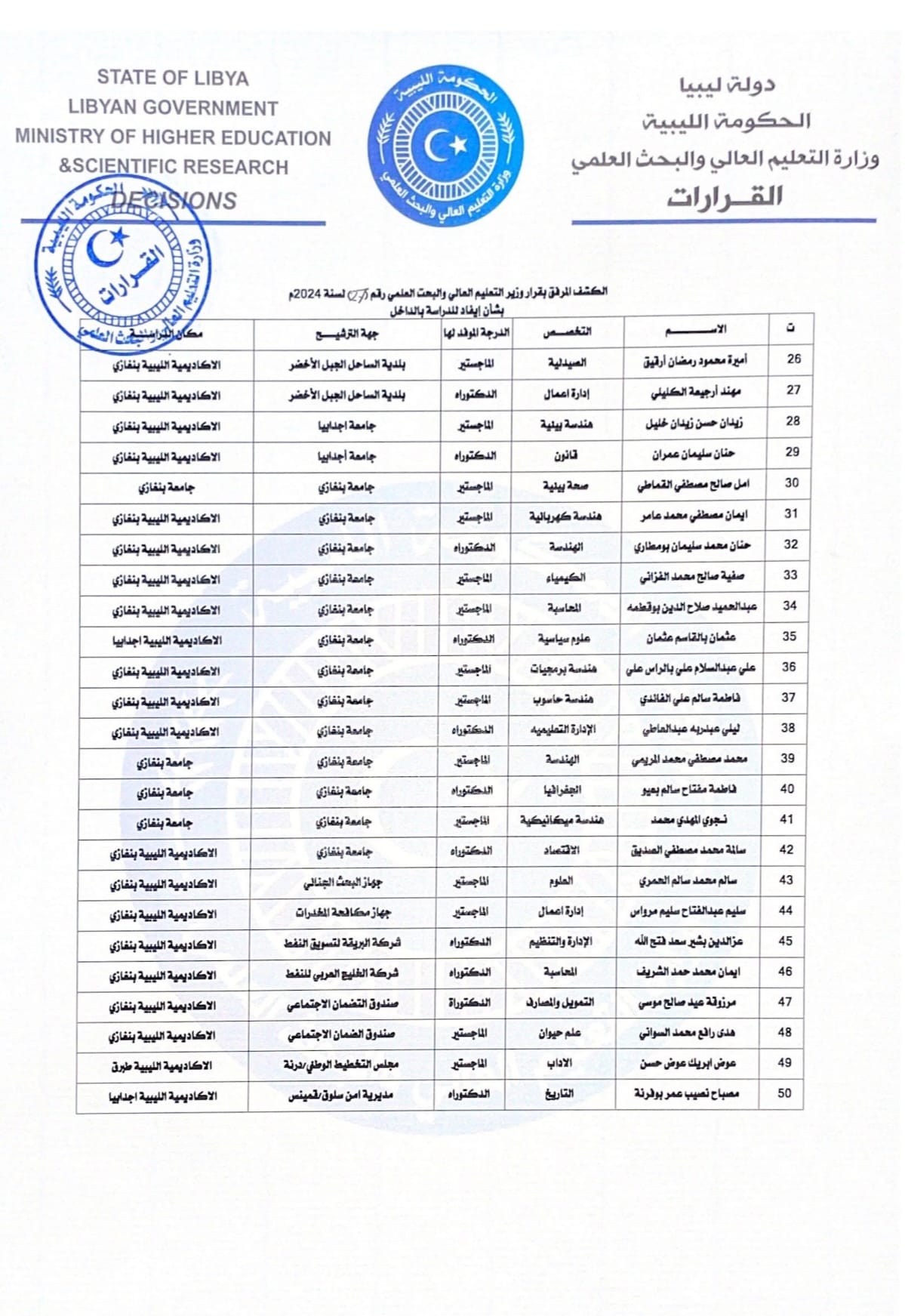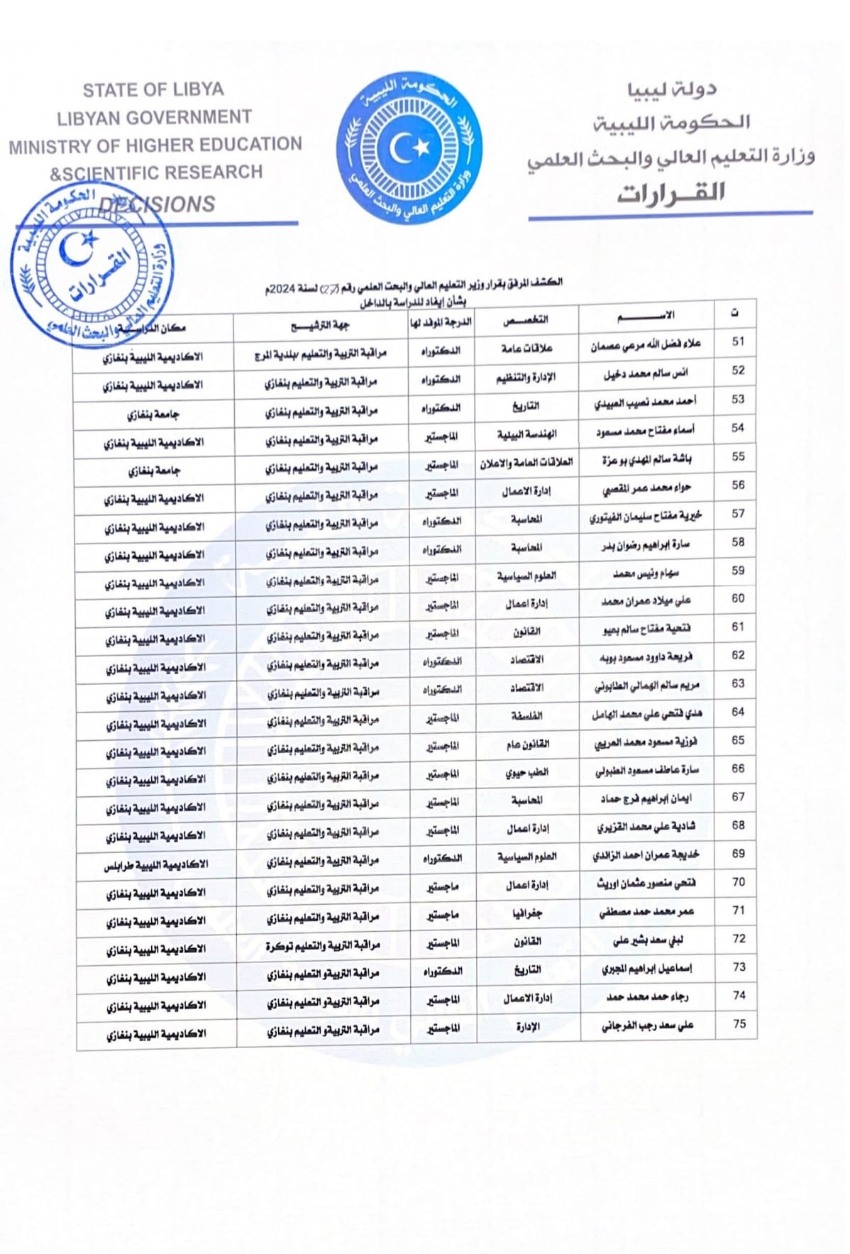 وزارة التعليم العالي والبحث العلمي بالحكومة الليبيةيونيو 13, 2024Comment 0 #خبر #قرارات قرار معالي وزير التعليم العالي و البحث العلمي أ. المهدي شعيب السعيطي رقم ( 27 ) لسنة2024م بشأن إيفاد للدراسة بالداخل لعدد ( 111 ) طالب لتحضير درجتي الدكتوراه والماجستير كلٌ حسب درجته واختصاصه. #مكتب_التواصل_و_الإعلام Share this post قرار ايفاد 46 لسنة 2024 Related Posts مدير إدارة التخطيط والتطوير تطلع على الخطة الإستراتيجية لكلية القانون Posted on يوليو 9, 2024 وكيل وزارة التعليم العالي والبحث العلمي يجتمع مع مدراء الإدارات المعنية Posted on يوليو 9, 2024 وزارة التعليم العالي والبحث العلمي تباشر في حملة دعم المؤسسات التعليمية Posted on يوليو 3, 2024